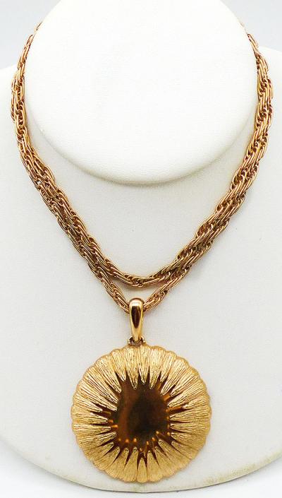 Description: Monet gold plated sunburst pendant necklace; a large round sunburst motif pendant with a textured gold tone explosion of jagged rays layered over a polished gold tone base showing through the center. The pendant is on a large bail hanging from a twisted gold plated chain with folder clasp. Signed 'Monet©' on the back of the pendant and clasp.