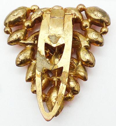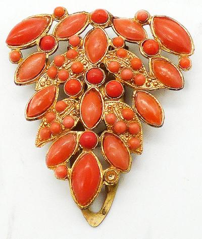 Description: Vintage gold plated leaves and orange glass stones dress clip, the gold tone leaves are set with opaque orange glass ballotini stones and orange glass navette cabochons are alongside with larger ballotini between.
