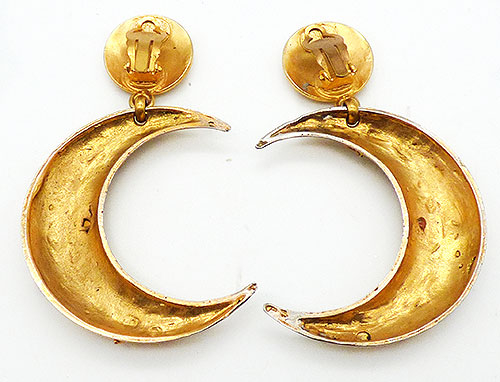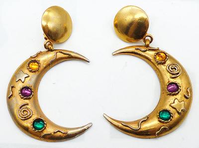Description: Edouard Rambaud vintage gold plated oversized dangling crescent clip earrings; each is decorated with a golden topaz, amethyst and emerald green glass cabochon along with an embossed star, spiral and squiggles. The crescent hangs from a flat disc at the top. Signed 'Edouard Rambaud Paris' on the backs.