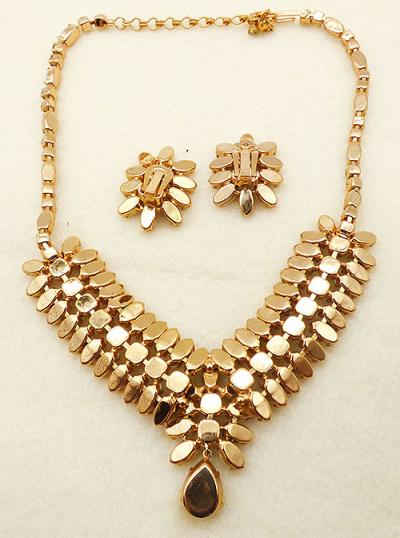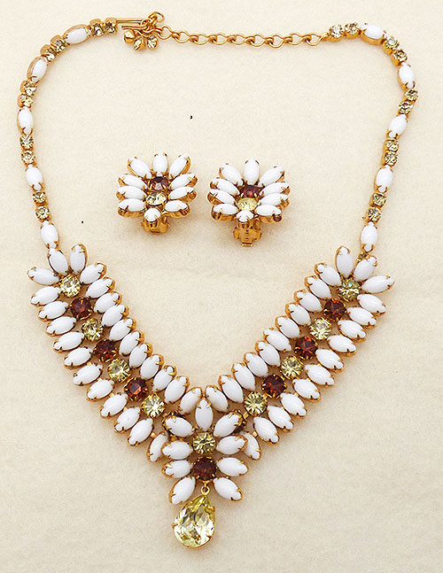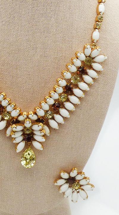 Description: Vintage old [lated white milk glass navette, yellow and topaz rhinestone necklace and clip earrings set; the vee shaped necklace has a row of alternating dark topaz and lighter yellow round rhinestone rows bordered with angled white milk glass navette cabochons. A larger yellow rhinestone teardrop dangles from the necklace center and the clip earrings match that centerpiece exactly. The necklace chain is alternating white glass navettes and pairs of light yellow rhinestone with a gold tone extender chain and trio of dangling rhinestone and hook clasp.