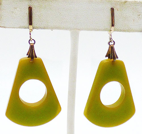 Description: Vintage pea rope green bakelite screw post earrings; pie-shaped pea green bakelite pieces have circles cut outs in the center and hang from gold tone screw posts.
