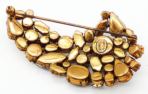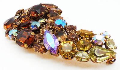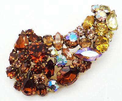 Description: Austrian vintage gold plated topaz rhinestone ombré brooch; a curved sweep of stones in four shades. Dark topaz rhinestones blend into Colorado topaz, then to golden topaz and finally yellow rhinestones at the tip of the curve. All rhinestones are a variety of sizes and shapes with some having an aurora coating for even more sparkle. Signed 'Made in Austria' on the back.