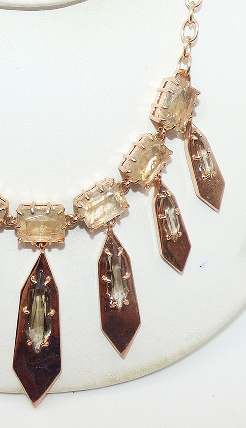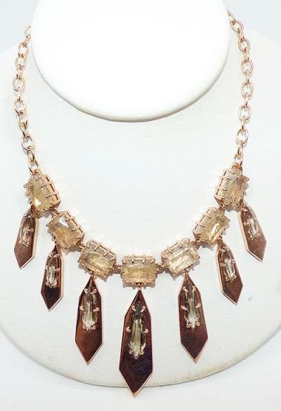 Description: Vince Camuto gold plated dangles and glass stone bib necklace; graduated size gold tone dangles are set with black diamond glass stones in their centers and hang from clear flawed glass rectangular stone links. Gold tone chain finishes the necklace on either side of the clear stones. A Camuto logo dangles from the end of the extender chain as does the original 'Vince Camuto paper hang tag.
