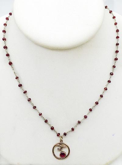 Description: Signed sterling sliver round pendant set with a genuine garnet stone hangs from a delicate garnet bead and sterling link chain finished with a length of silver chain and lobster clip. Signed '925' and possibly '©SAIK' though mark is not clear, on the back of the pendant.