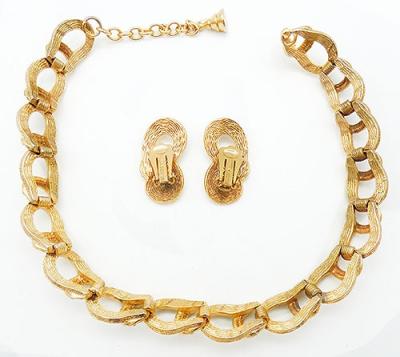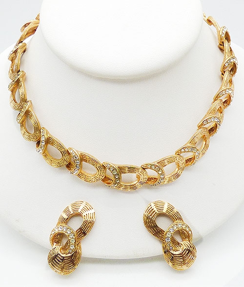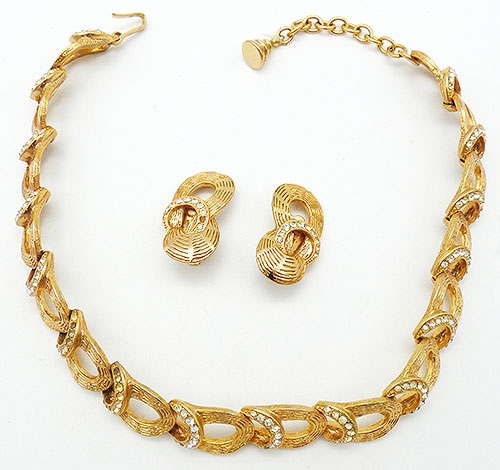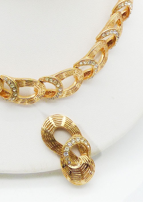 Description: Eisenberg rare vintage gold plated and clear rhinestone link necklace and matching clip earrings; heavily textured horseshoe shapes connect with crescents set with clear rhinestones for each of the sixteen links. The necklace is curved and choker length, does not flatten out, but hays perfectly high on the neck. Gold tone extender on one side, hook clasp on the other. The earring match the link with an extra wide swirl at the bottom. Signed 'Eisenberg' block letters, on the hook clasp and earrings clips, mark used before 1955.