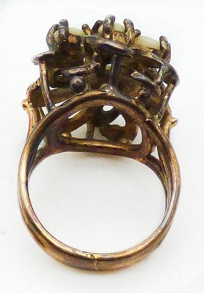 Description: Joe Esposito sterling vermeil floral cocktail ring; the flower is set with off-white gemstone marquis cabochons, possibly white opals. It sits in a very tall tiered setting wth curls around each stone. Triple band and signed 'Espo Sterling' on the inside, mark for Joe Esposito.