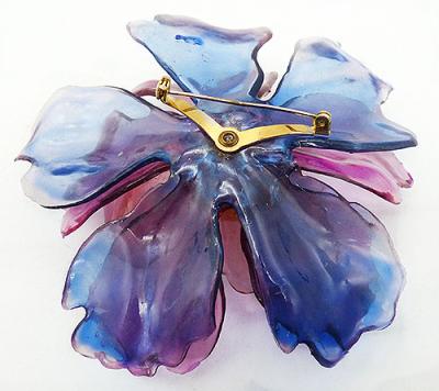Description: Cellulose Acetate vintage oversized flower brooch; three layers of cellulose acetate petals - blue on the bottom, purple in the middle and pink on the top. The center is yellow-ish lucite studded with pink rhinestones.