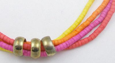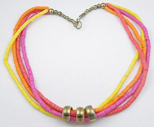 Description: Vintage bright neon orange, red, yellow and pink bead 4-strand heishi bead necklace. The strands are threaded through three brass slider rings, the heishi beads are dyed coconut. The necklace is finished with brass beads and large hook clasp.