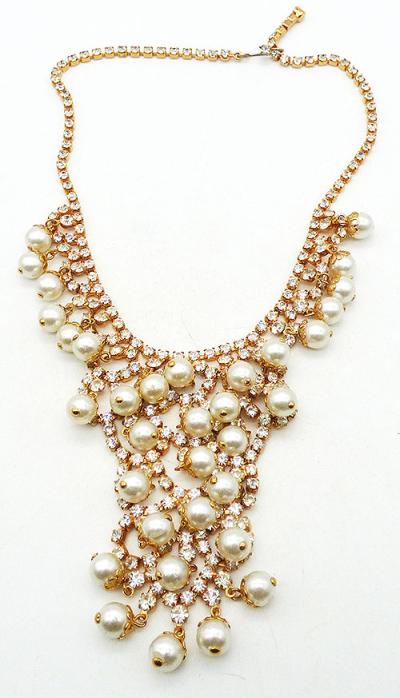 Description: Vintage gold plated cess rhinestone and fur pearl dangle bib necklace; white faux pearls hang from the ends of clear rhinestone scallops that create the leg narrow column center focus. More pearls dangle along a second row of rhinestones on either side of the column and then the necklace is finished with clear rhinestone chain. Hook closure on one side.