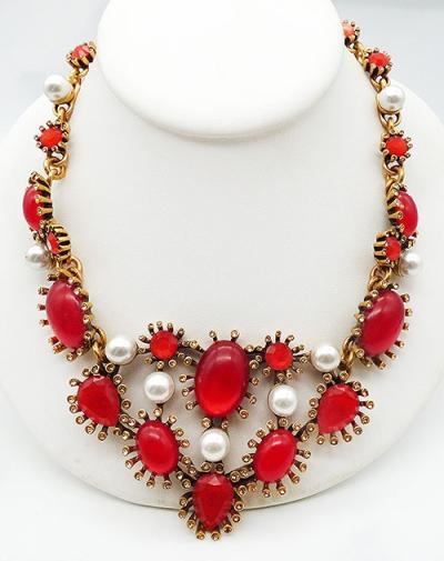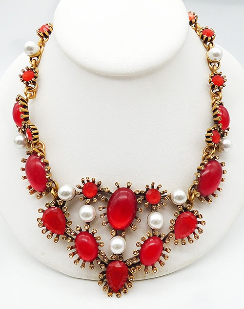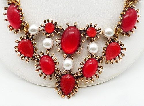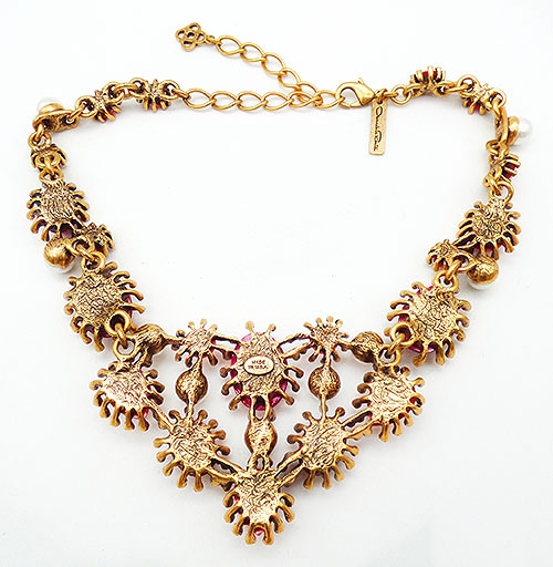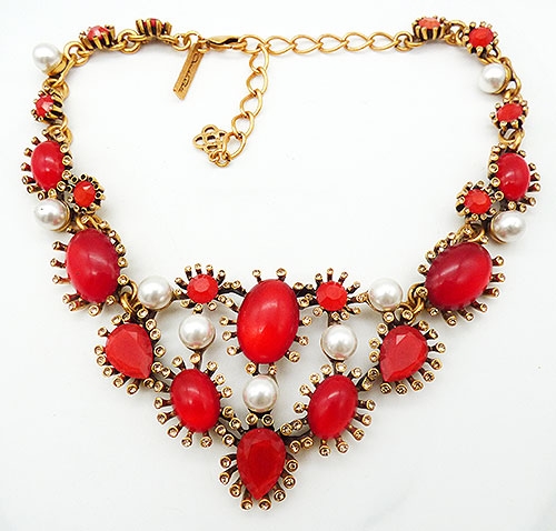 Description: Oscar de la Renta gold plated bib necklace featuring larger red acrylic oval cabochons and red acrylic rhinestones, each surrounded by champagne rhinestones in individual settings and wth faux pearls between the cabochon settings. The center section is connected to links with red oval cabochons which then link to chain set with red rhinestones and faux pearls. Lobster clasp on one end, gold extender chain on the other. Signed 'Oscar de la Renta' and 'Made in USA' on a hang tag near the clasp.