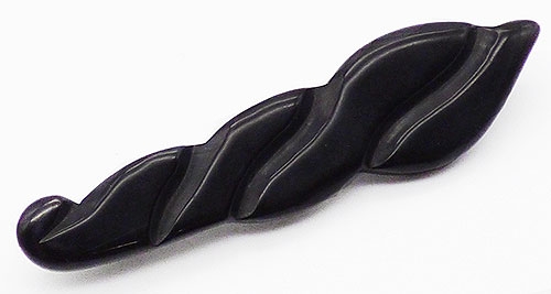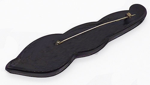 Description: Vintage black bakelite brooch; large and simply but deeply carved into a flame or torch design, wider at one end. Original embedded pin back.
