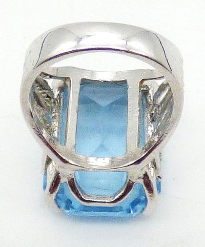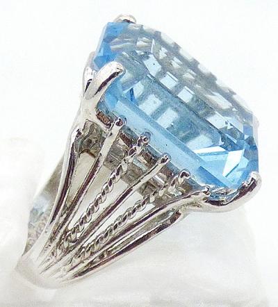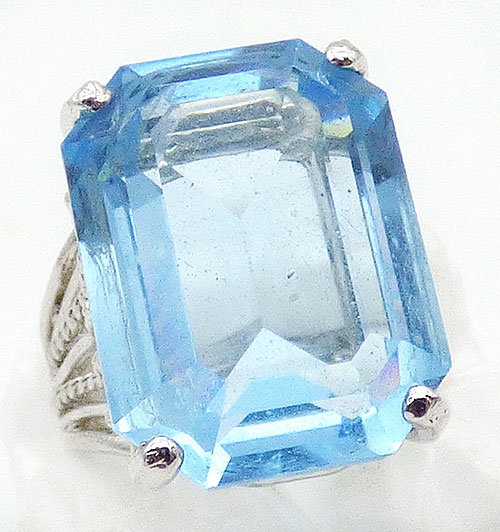 Description: Vintage Aurora Jewelry Co 18K white HGE (Heavy Gold Electroplate) ladies fashion cocktail ring set with a large faceted light blue glass rectangular stone. The stone is in a tall setting with alternating twisted and smooth white gold tone wires tapering to the side to the band. Hallmarked '18KT H.G.E.' with an 'A' in a circle, mark for the Aurora Jewelry Co, appears to have been in business from mid-1950's through about 1980.