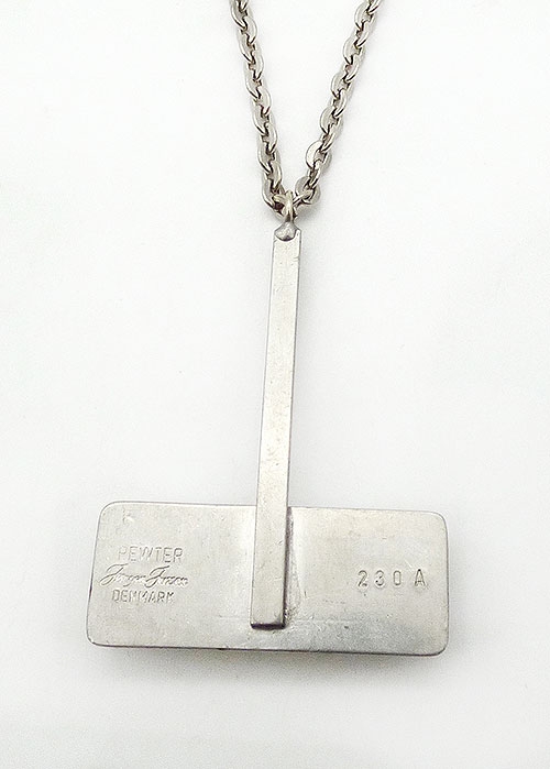 Description: Jorgen Jensen Denmark vintage pewter mid-century modernist necklace; a tee shaped pendant on its original chain. The pendant has a wide rectangular base set with a narrow lime green glass pointed oval stone, the base is bisected with a tee bar that attaches to the chain. Signed 'Jorgen Jensen' 'Pewter' 'Denmark' and style number '230A' on the back. -