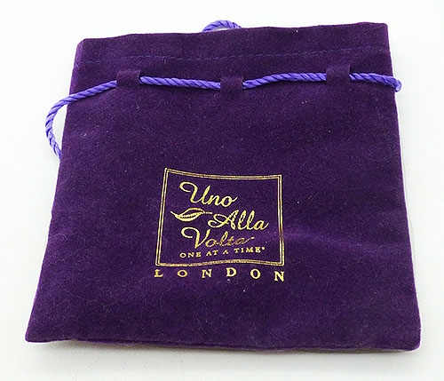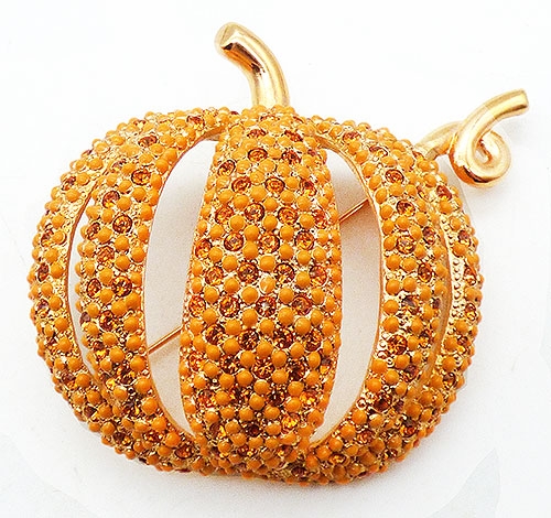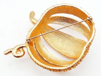 Description: Daniel Lyons gold plated domed pumpkin brooch made exclusively for Uno Alla Volta London. The large 23k gold plated pumpkin set with orange Swarovski crystals between orange enamel beads. Comes in its original Uno Alla Volta purple presentation pouch.