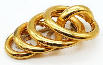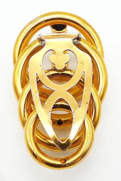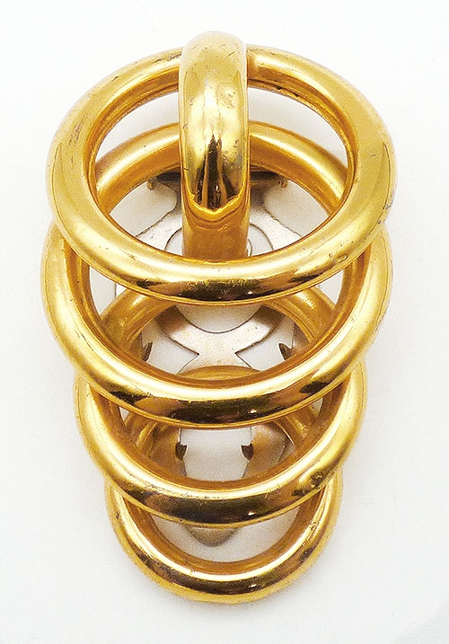 Description: Vintage Retro Moderne gold plated stacked rings dress clip; four gradated size rings are sacked at an angle, largest down to smallest, with a partial ring rotated vertically at the top.