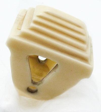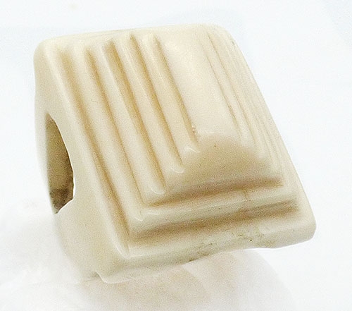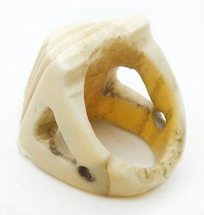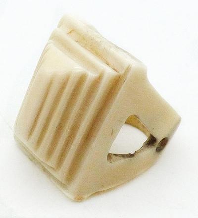 Description: Antique Art Deco period hand carved bone pyramid ring; the tall ring is chunky and large with steps carved up the sides to form the pyramid. The wide band tapers from the sides with triangle and small circle cut-outs on both sides.